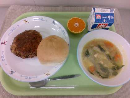 今日の献立は「ねりまるキャベツのメンチカツバーガー」「カレースープ」「花みかん」です。
