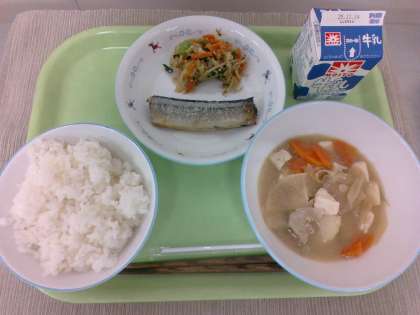 今日の献立は「ごはん」「さんまの塩焼き」「野菜のごまあえ」「豚汁」です。