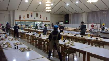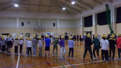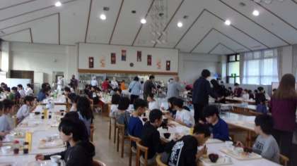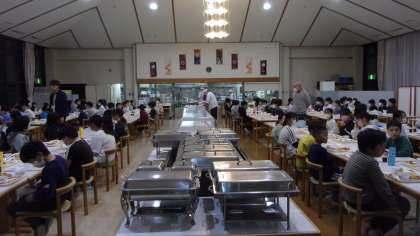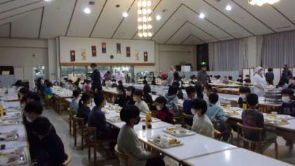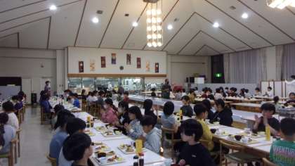 18時、夕食をおいしくいただきました。食事係が協力しながら丁寧に配膳のお手伝いをすることができました。みんな楽しく過ごしています。夕食後は体育館で学年レクを行います。