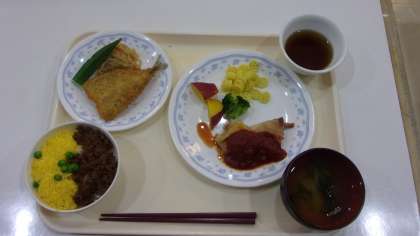 今日の献立は「こぎつねごはん」「鮭のパン粉焼き」「磯香和え」「さつまいもの味噌汁」です。