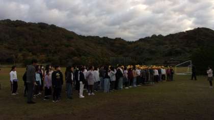 6時25分、2日目の朝を迎えました。雲は多いですが晴れ間が見られます。山と海の素晴らしい自然に囲まれて朝会を行いました。