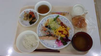 7時、セルフ形式の朝食です。今日一日元気に過ごすことができるようにしっかり栄養をとります。朝会で新鮮な空気を吸った後、みんなで食べる朝食はおいしいです。