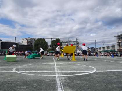 3年生の団体競技「出た目で勝負!」です。サイコロをふると1〜4の数字が出ます。その数字の分だけ、コーンを回るので、運も関係します。ワイワイとサイコロをふってみんなで楽しい競技でした!
