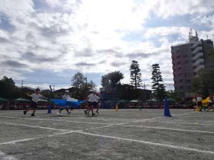 2年生の団体種目「おとさずはこべ!空とぶじゅうたんリレー」です。4色の段ボールが風で舞う様子は本当に空飛ぶじゅうたんのようです!2年生はこの競技をとても楽しんでいます!