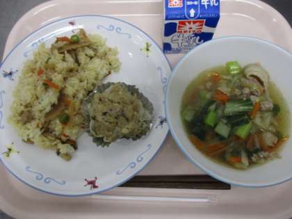 今日の献立は「中華おこわ・ジャンボ焼売・広東スープ・牛乳」です。