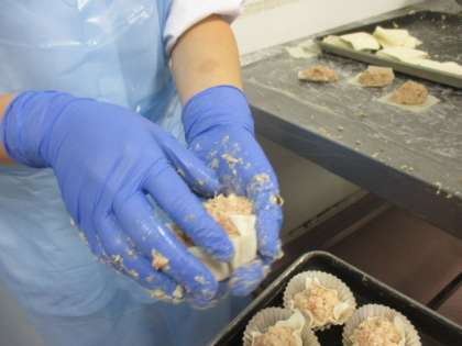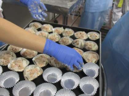 今日の焼売は、豚ひき肉・大豆・豆腐・玉葱・しいたけ・調味料などをよく練った肉だねを1つ1つ丸めて皮に包み、蒸しあげました。
