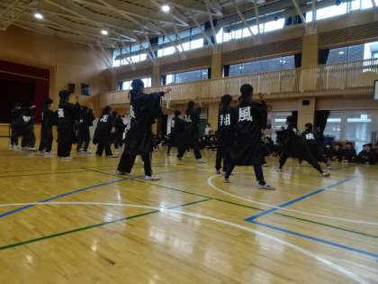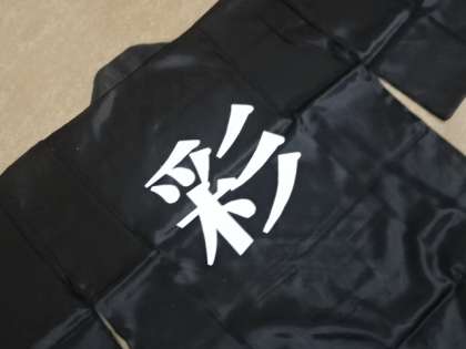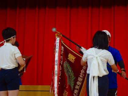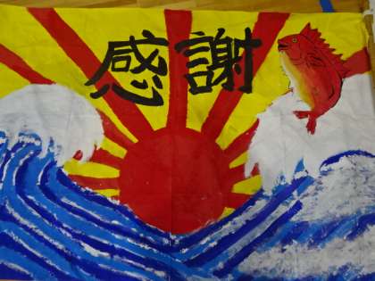 6年生が運動会のソーラン節の演技で使う大漁旗とハッピです。背中には自分で選んだ漢字一文字が描かれています。今日は雨でしたので、体育館で本番で着用するハッピを身に着けて踊っています。
