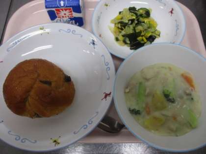 今日の献立は「レーズンシナモンロール・秋のクリームシチュー・わかめサラダ・牛乳」です。
