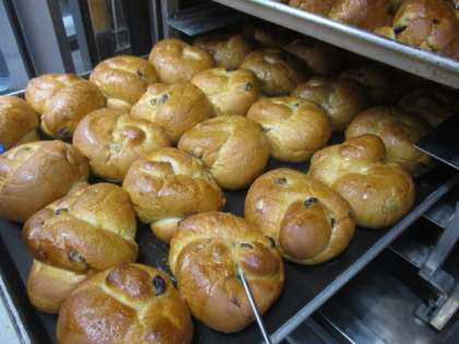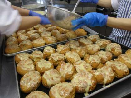 今日はパン屋さんからきたぶどうパンにシナモンシュガーを給食室で手作りし、上にのせて焼き上げました。