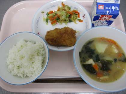 今日の献立は「ごはん・チキンタレカツ・キャベツのおかか和え・厚揚げと野菜の味噌汁・牛乳」です。