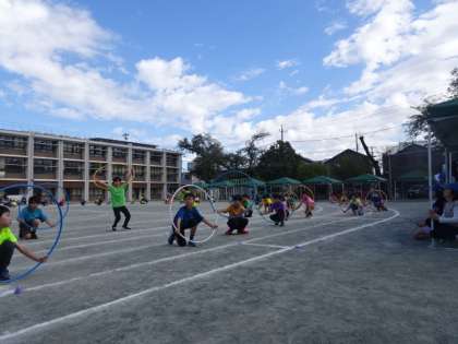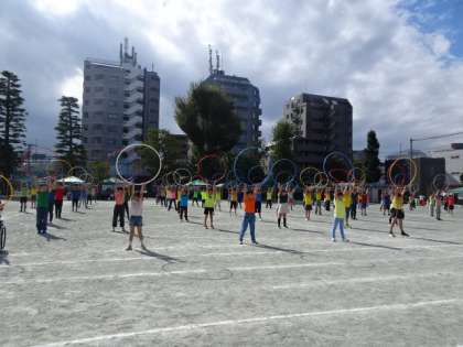 3年生のリハーサルです。笑顔が素敵な3年生。フープ使い日に日に上達し自信をもってやっています。