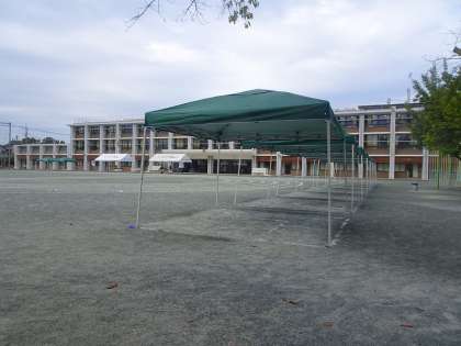1年生のリハーサルは、6年生も見守ってくれていました。今日は体育着は着用しないで踊りました。児童席にはテントを設置していますので、後方から見た感じは写真を参照してください。テント席の後方からは見にくいかもしれませんが、子供たちの様子は間近で見ることができます。