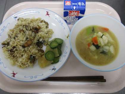 今日の給食は「さんまご飯・即席漬け・里芋と白菜の味噌汁・牛乳」です。