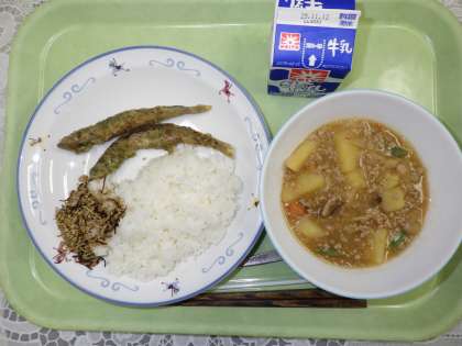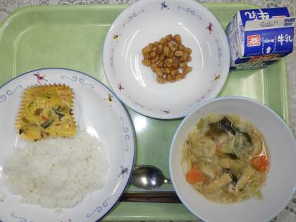 ・千草焼き ・甘辛大豆 ・キャベツのみそ汁 ・牛乳 甘辛大豆は、ゆでた大豆にでん粉をまぶして揚げ、しょうゆや砂糖、みりんなどで作った甘辛いタレを絡めたものです。豆類は残りがちですが、甘辛大豆は好きな子が多く、今日もよく食べていました。 アツキヨ 「夢コンサート」