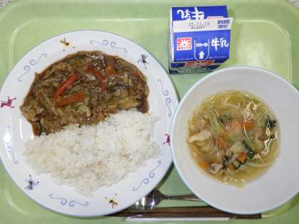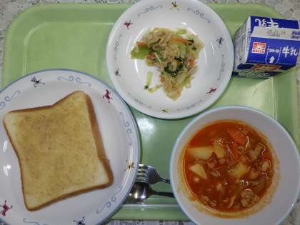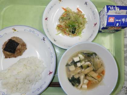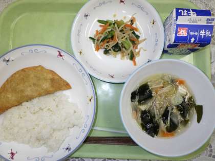 ・ジャンボ揚げギョウザ ・ナムル ・わかめスープ ・牛乳 今日は子供たちに人気のジャンボ揚げギョウザでした。豚肉・キャベツ・ニラをよく練って大きなギョウザの皮で包んで揚げました。 スープには、マグネシウムやカルシウムなどのミネラルや食物繊維が豊富なわかめをたっぷり入れました。 11月6日(木)今日の給食