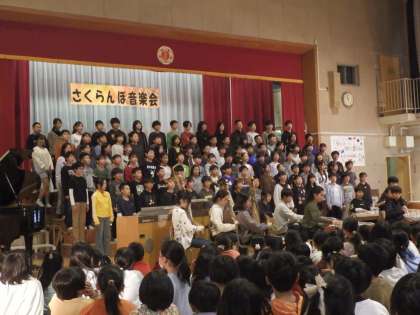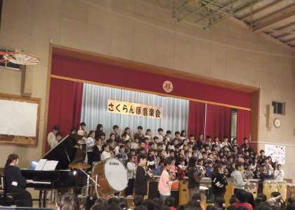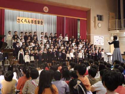 3年生は、リコーダーの学習を始めたばかりですが、タンギングの技法をしっかり身につけ、美しい音色を響かせることができました。 音楽劇「おしいれの冒険」より「きみに」合唱 3年生になって初めてチャレンジした2部合唱です。自分の音を大切にし友達の音を聞いて心を合わせてハーモニーを作りました。 「聖者が街にやってきて、村祭り」合奏 「聖者が街にやってきた」から「村祭り」へ次第に移っていくイメージです。たくさんの楽器を使った合奏も初挑戦でした。 さくらんぼ音楽会 (1年生)