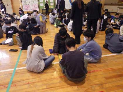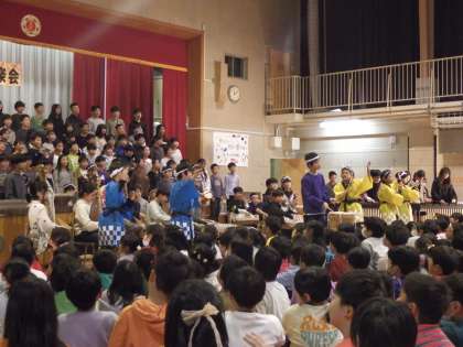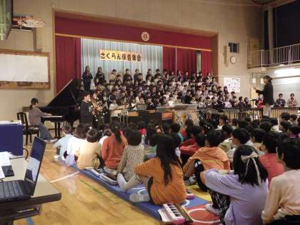 和楽器を使い日本の様々なジャンルの音楽を表現しました。雅楽が元になった「越天楽今様」、現代音楽から三木稔作曲「秋、そして」、歌舞伎音楽の長唄「越後獅子」より、わらべ歌の「ずいずいずっころばし」、上州地方の民謡「八木節」とつながっていきます。 八木節では、踊り手が登場するなど、子供たちが自主的に考えた取り組みも含まれていて見ごたえ抜群でした。箏や琵琶などの和楽器演奏やわらべ歌の合唱など難易度の高い演目にチャレンジした6年生、流石です。 さくらんぼ音楽会(4年生)