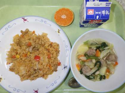 ・ミートボール入りポトフ ・みかん ・牛乳 ジャンバラヤは、アメリカ南部ルイジアナ州の代表的な料理で、チリペッパーなどの香辛料で味付けされ、ピリッと刺激的な味わいが特徴です。給食では低学年でも食べやすいように、低学年と高学年と香辛料の量を変えて作っています。 ポトフには、給食室で手作りしたミートボールや野菜をたっぷり入れました。 連合音楽鑑賞教室