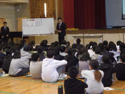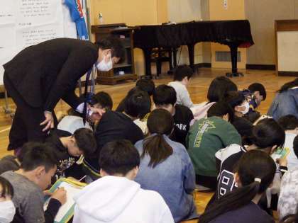 国語の学習で、スイミーの気持ちや場面の様子などを考え、音楽の時間に場面ごとの曲を練習してきました。合奏も工夫し、手作りの楽器で波の音を表現したり、情景に合う効果音を入れたり子供たちのアイディアが際立っていました。台詞もタイミングよく堂々と大きな声で言えました。 (写真は、練習時の様子です) さくらんぼ音楽会(5年生)