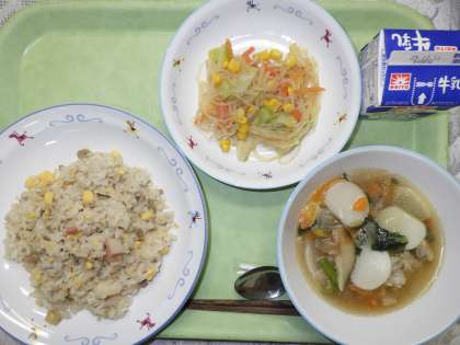 ・春雨サラダ ・トックスープ ・牛乳 チャーハンは中華料理のひとつで、ごはんに肉や卵、野菜などを混ぜて油で炒め、塩やしょうゆで味付けして作ります。給食では人数分のご飯を炒めて作ることができないので、お肉やなると、長ねぎなどの具を炒め、炊いたごはんに混ぜ合わせて作っています。 東京都小学校特別活動研究会