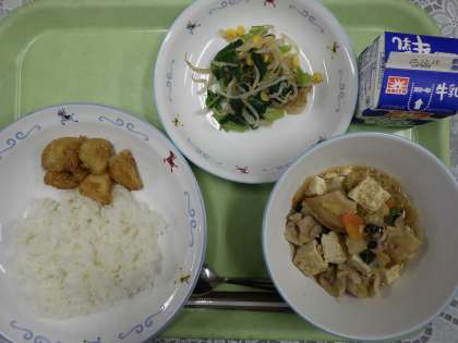 ・肉豆腐 ・じゃがいものごまだれ ・コーン入りお浸し ・牛乳 肉豆腐の豆腐は、焼き豆腐を使いました。焼き豆腐は、水切りをした豆腐の両面を直火で軽くあぶり、焼き目をつけたものです。木綿豆腐に比べて崩れにくいので、すき焼きや田楽、煮物などの料理に使われます。 じゃがいものごまだれは、じゃがいもにでん粉をまぶして揚げ、練りごまやしょうゆ、砂糖で作ったごまだれを絡めたものです。子供たちにも好評でした。 練馬大根