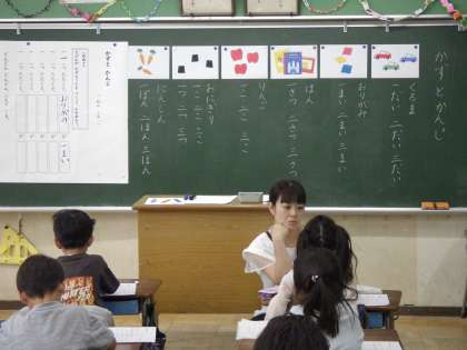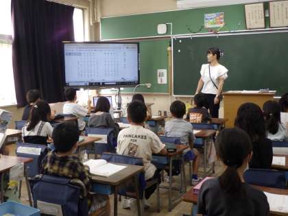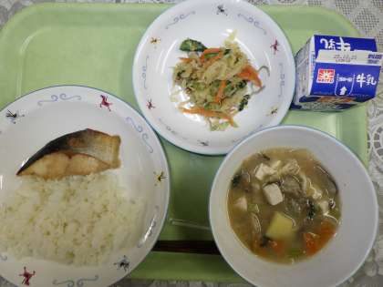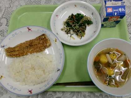 ・魚の香味焼き ・じゃこ入り和風サラダ ・具だくさんみそ汁 ・牛乳 今日の魚の香味焼きには、秋が旬の「鮭」を使いました。鮭は身は赤いですが、白身魚に分類されます。今日は、にんにくや生姜、ねぎなどの野菜としょうゆなどの調味料で下味を付けて焼きました。しっかりとたれに漬け込んでから焼いたので、魚の臭みもなくおいしく仕上がりました。 1年生 国語「かずとかんじ」