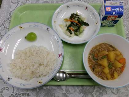 ・じゃがいものそぼろ煮 ・キャベツとわかめの酢の物 ・くだもの(シャインマスカット) ・牛乳 酢は疲労回復効果、カルシウムの吸収促進などの効果があるといわれています。酢の物が苦手な子も多いですが、積極的にとって欲しいと思います。 今日のくだものは、長野県産のシャインマスカットでした。 あいさつは心と心を通わす第一歩