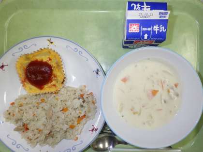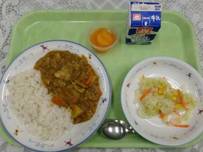 ・コーンサラダ ・みかんゼリー ・牛乳 今日は、人気のカレーライスでした。給食のカレーライスは、市販のルーを使わずに小麦粉と油を炒め、玉ねぎを飴色になるまでしっかり炒めて作ります。今日も食缶が空っぽのクラスが多かったです。 秋の読書旬間