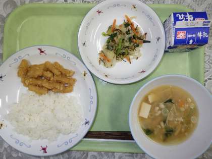 ・いかのかりん揚げ ・野菜の塩昆布和え ・生揚げのみそ汁 ・牛乳 いかのかりん揚げは、短冊切りしたイカに、しょう油やみりんで作った調味料で下味をつけました。 片栗粉をまぶして、カリッとなるまで揚げています。 野菜の塩昆布和えは、茹でた野菜に塩昆布とごま油のみで味付けしています。簡単に作れるので、おうちでも作ってみてください。 代表委員会 校内音楽会に向けて