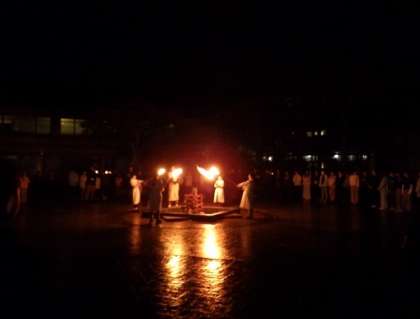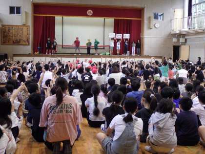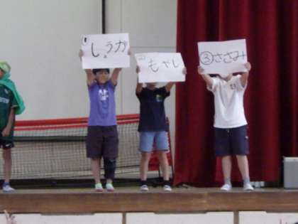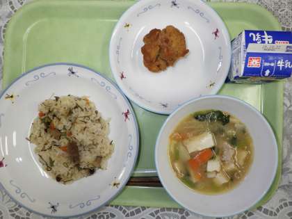 ・イナムドゥチ ・サーターアンダギー ・牛乳 今日は沖縄県の料理でした。 「クファジューシー」は炊き込みご飯のことです。給食では豚骨やかつお節でとっただしを加えて炊いたごはんに豚肉や刻み昆布などで作った具を混ぜて作っています。 「イナムドゥチ」は豚肉の入った味噌汁で、お祝いの時に食べる料理だそうです。「イナ」はイノシシ、「ムドゥチ」はもどきで、「イノシシもどき」という意味があり、昔はイノシシ肉を使っていたことからこの名前がついているそうです。 「サーターアンダギー」は沖縄伝統の揚げ菓子です。今日は、上白糖の他に黒砂糖も使いました。 6年生 軽井沢移動教室1日目(5)