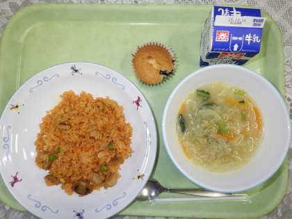 ・キャベツのスープ ・ブルーベルーマフィン ・牛乳 給食のチキンライスは、ごはんに鶏肉と玉ねぎ、人参、マッシュルームをトマトケチャップやトマトピューレなどの調味料で味付けをした具を混ぜて作ります。今日は、白いごはんではなく、トマトジュースを加えて炊いて味と色を付けたごはんで作りました。 給食委員会集会