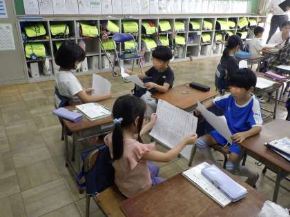 折り紙は一枚,二枚、リンゴは一個,二個、えんぴつは一本,二本、本は一冊,二冊、自動車は一台,二台。正しい漢数字と単位を用い、語と語の続き方に注意しながら文を書き表しました。お友達と読み合うときには、「ほん」や「ひき」は、「ぽん」や「ぴき」「びき」に変化することにも気付きました。 10月10日(金)今日の給食