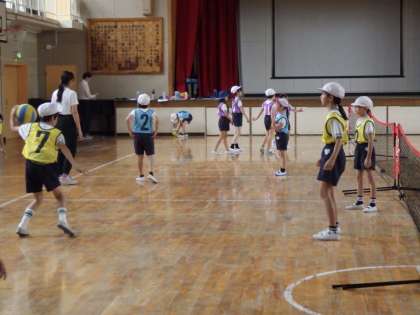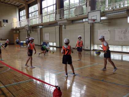 ・スパニッシュオムレツ ・クリームスープ ・牛乳 スパニッシュオムレツは、スペインではトルティージャと呼ばれています。じゃがいもや玉ねぎ、ベーコンなどの具材を炒め、卵を流し入れ、円形状に焼いた卵料理です。今日は、一つずつ丸いカップに入れてオーブンで焼きました。焼き上がったオムレツの上にはケチャップをトッピングしました。 3年生 体育「プレルボール」