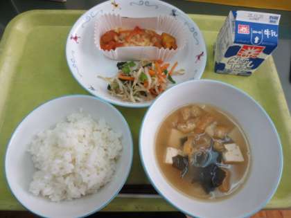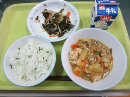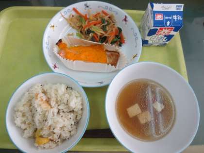 じゃこ菜飯 牛乳 厚揚げの野菜あん きゅうりとわかめの酢の物 今日の給食は『じゃこなめし』についてです。 じゃこ菜飯は、炊きあがったごはんにオーブンで加熱したじゃこや、こまつなを混ぜ込んで作りました。 じゃこには、骨や歯をじょうぶにするカルシウムがたっぷり含まれています。こまつなにもカルシウムやビタミンCが多く、風邪をひきにくくしてくれます。 風邪が流行っているのでしっかり食べて元気すごしましょう! 11月7日(金)