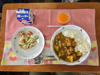 チキンカレーライス 牛乳 レモンドレッシングサラダ 夕焼けゼリー 【給食新聞より】 今日の給食のデザートは『夕焼けゼリー』です。 夕焼けゼリーは、夕焼けがきれいに見える季節になってきたので、そんな季節にぴったりの夕焼けをイメージして作りました。みかんジュースとすりおろしたにんじんを合わせて作っています。にんじんには、ビタミンCやベーターカロテンがふくまれていて風邪をひきにくくしたり、肌を元気にしてくれる力があります。 2枚目にゼリーをカップに注ぎ入れたあとの写真を載せました。 今日は試食会を行いました。 参加していただいた保護者の皆様本当にありがとうございました。 今後とも本校の給食にご理解とご協力をよろしくお願いいたします。 5年生 岩井移動教室1日目