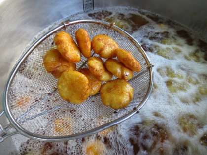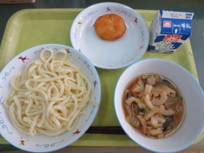 ちゃんこうどん 牛乳 チーズいももち 今日の給食の『いももち』は、じゃがいもをゆでてつぶし、片栗粉を加えているのでもちもちした食感になります。これを一つずつ丸め、油で外側がカリっとなるように揚げました。バターや粉チーズ、ピザチーズも入っているので成長期に必要なカルシウムもとることができます。 5年生 岩井移動教室2日目