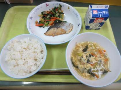 麦ご飯 牛乳 魚のしょうが焼き 野菜の辛し和え かき玉汁 11月10日(月)