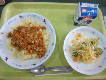 大豆入りキーマカレー 牛乳 じゃがいものハニーサラダ 今日のサラダは『じゃがいものハニーサラダ』です。 じゃがいもは千切りにして油でカリっと揚げてあります。ドレッシングには、はちみつを入れました。 はちみつの甘さとじゃがいものカリっとした食感をよく味わっていただきましょう! 11月11日(火)