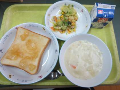 アップルトースト 牛乳 ホワイトシチュー ツナと野菜のサラダ 今日は『アップルトースト』です。りんごを煮てからジャムと混ぜたものをパンに塗ってやきました。 りんごは、紅玉という種類のものを使いました。 紅玉は甘みと酸味のバランスがよく煮崩れしにくいため、アップルパイなどのお菓子によく使われます。 感染症が流行っているので食べる前にしっかり手洗いをしましょう! 11月12日(水)