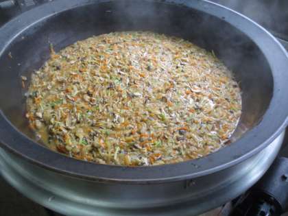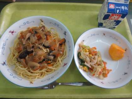 きのこの和風スパゲティ 牛乳 れんこんサラダ 柿 きのこの和風スパゲティは、しいたけ・ぶなしめじ・エリンギ・えのきたけの4種類のきのこを使って作りました。 2枚目の写真は、きのこスパゲティのソースを作っている時の写真です。 11月17日(月)