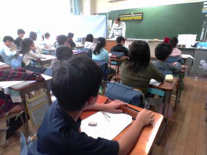 学校の周りを歩きながら、危ないところや安全なところを見つけました。 「ここは、車が多いから危ないね。」 「車通りは多いけど、横断歩道があるから安全だね。」 「ひまわり110があった!!」「ここにもある!」 などと、 気付いたことを話し合いながら真剣に調べていました。 4年 そろばん