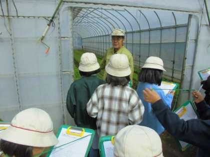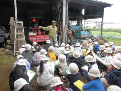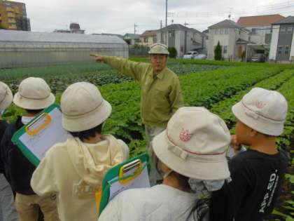 今日は、田中農園へ行ってきました! 田中農園は関町小学校からとても近く、歩いて5分程度で着きます。 そこで、農園で作っている野菜を見たり、道具や思いなどを聞いたりしました。 「食べてくれる人がおいしい!と思ってくれる野菜を育てています。そのために、毎日欠かさず畑に足を運んでいるんだよ。」 「毎日、収穫することができるように、種を蒔く日を工夫しているよ。」 「昭和の頃の練馬区は、ほとんどキャベツばかり育てていたけど、最近では、収益が高い野菜を育て始めているんだ。」 100m×100mの広大な畑でしたが、区分けがきちんとされていて、どの野菜も青々ととてもおいしそうでした! 「今度、お家の人と野菜の自販機で買ってみよう!」 「苦手だけど、今度から頑張って野菜食べよう!」 帰りがけにそんなことを話す子も・・・♪ 自分たちの食生活を支えてくれている農家さんの思いに触れ、自分を見つめ直す3年生なのでした。