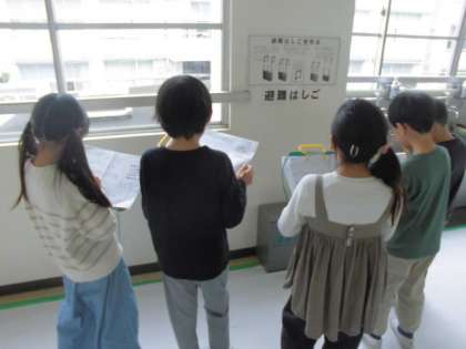 「思ってたよりも火災を知らせる機械があるんだね!」 「結構、階段の辺りにいろいろな設備があるなぁ〜」 学校には、たくさんの消防設備があり、部屋ごとに火の元を確かめる人が決まっています。 次は、消防署へ見学です!! 今からワクワクがとまらない3年生なのでした。