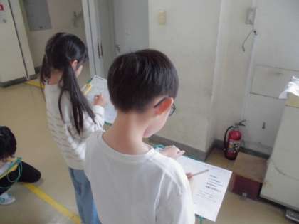今日は、学校内にある消防設備を調べ、それを校舎図にまとめる活動をしました。