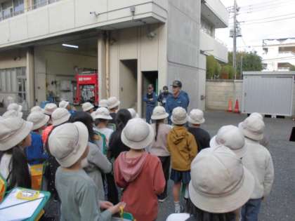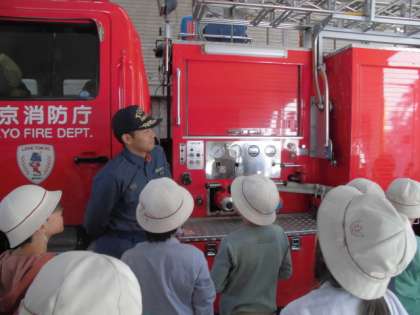 「あ!救急車がある!!」 消防署が見えてきただけで、子どもたちは大興奮! やる気満々です!! 「あの高いものはなんですか?訓練に使うものですか?」 「あれは、ホースを乾燥するものだよ。」 など、たくさんの質問に消防士さんたちが優しく教えてくれました。 また、消防服に1分もかからずに着替えるところを見せてくれたり、日常的に使っている食堂や仮眠室、通信室なども見学したりすることができ、大満足な子どもたち。 「早く火災現場に駆けつけて、多くの人を救助することを心がけている」と行っていた消防士さん。 安全を守るためにすぐに出動できる仕組みだけでなく、自分たちが火事を起こさない大切さもわかった子どもたちなのでした。