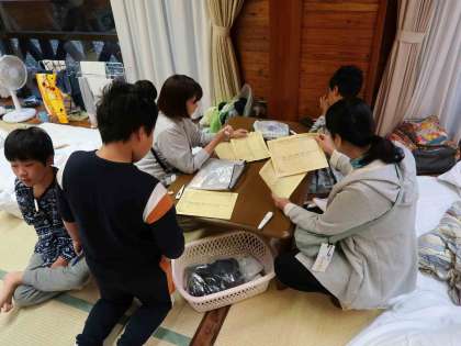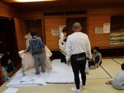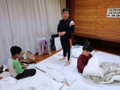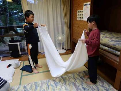 三日目最終日の朝です。いつものように検温をして健康カードに記録をして先生に報告します。今日は最終日なのでシーツなどを片付けて、来た時よりも奇麗にして帰ります。シーツは大きいので友達と協力して片付けます。大事な学びです。みんな元気です。
