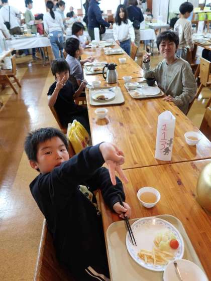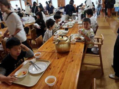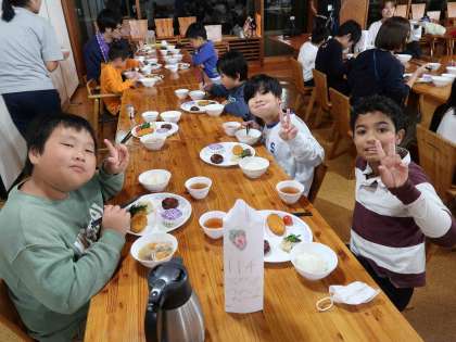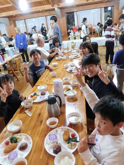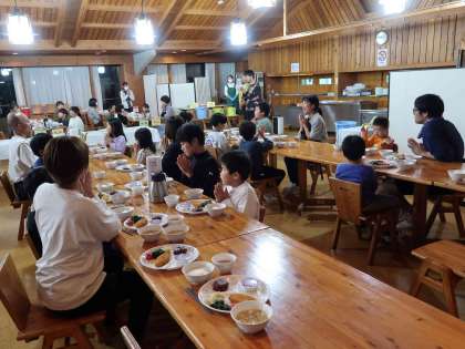画像は、二日目の夕食風景です。いっぱい活動してきたので、明日も元気に活動できるようにモリモリ食べています。ハンバーグにコーンクリームコロッケなど、好きなメニューかな?豚汁は、具沢山で温かく心にしみました。