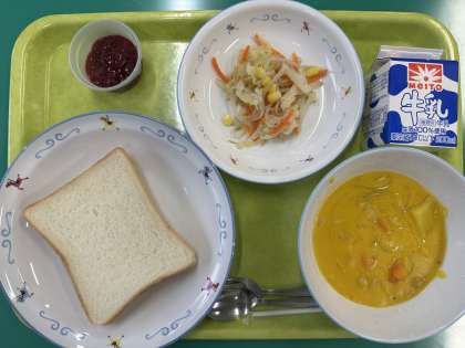 牛乳、食パン、ブルーベリーミルククリーム、かぼちゃのクリームシチュー、マスタードサラダ