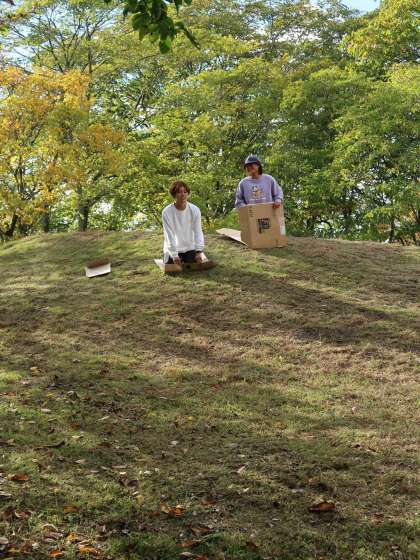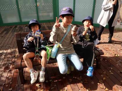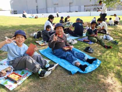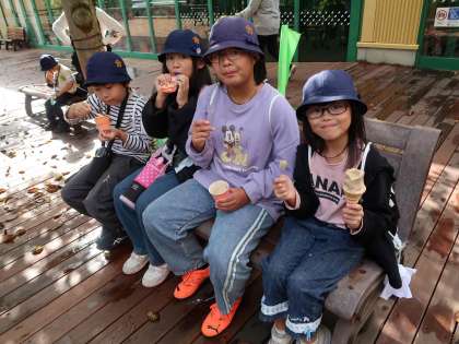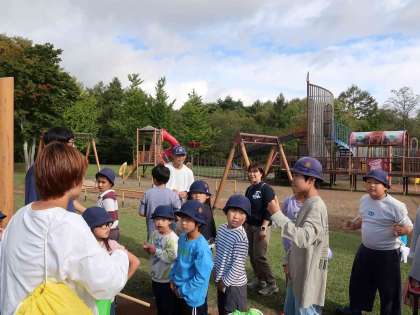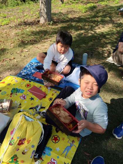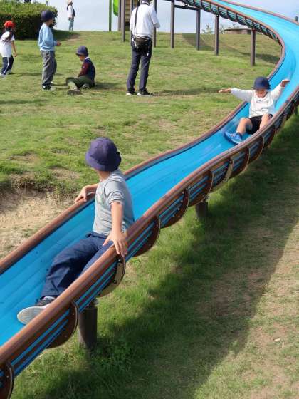 おやつの後は、遊具での自由活動です。先生からの遊び方の注意事項を聞いて、みんなで楽しく遊びました。お姉さんが下の子の面倒を見ながら遊んでいたり、友達同士で学校ではできない遊具を使ったごっこ鬼遊びを工夫していたりしてとても楽しそうです。段ボール滑りにもチャレンジしましたが、芝生が湿っていてなかなか滑れませんでした。チャレンジが大事です。