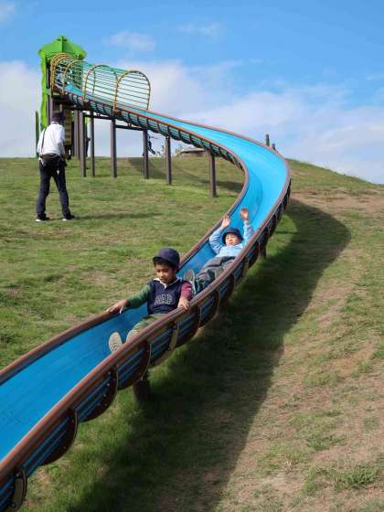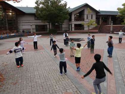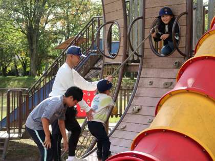 お弁当をおいしくいただいた後は、みんなで楽しく遊びました。大きなすべり台を体験したり芝生の坂を丸太になって転がったり、先生も一緒に遊んでいます。軽井沢宿泊学習の思い出になりました。